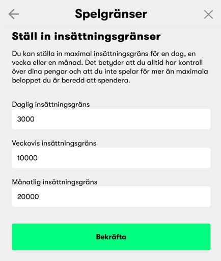 Observera: Eventuella höjningar av din insättningsgräns träder endast i kraft efter 72-timmars betänketid. Efter detta måste du bekräfta ditt beslut genom att klicka på knappen "Bekräfta" på samma sida. Vi rekommenderar att du noggrant bedömer om du har råd med en höjning innan du ändrar din insättningsgräns.