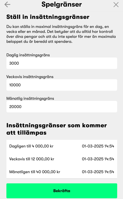 - Insättningsgränser hjälper dig att styra hur mycket du kan sätta in dagligen, veckovis eller månadsvis.