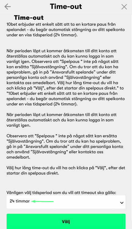 Du kan ta en paus från spelandet genom att använda vår Time-Out-funktion i 24 timmar. Under denna period kommer du inte att kunna logga in på ditt konto, men du kan fortfarande ta ut eventuellt kvarstående saldo genom att kontakta kundsupport. Ditt konto kan inte återaktiveras förrän perioden har löpt ut.