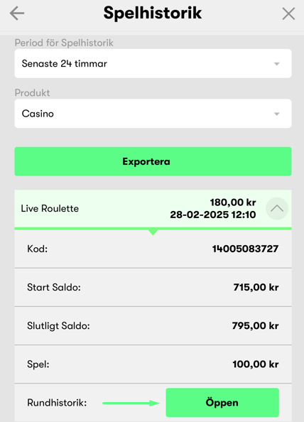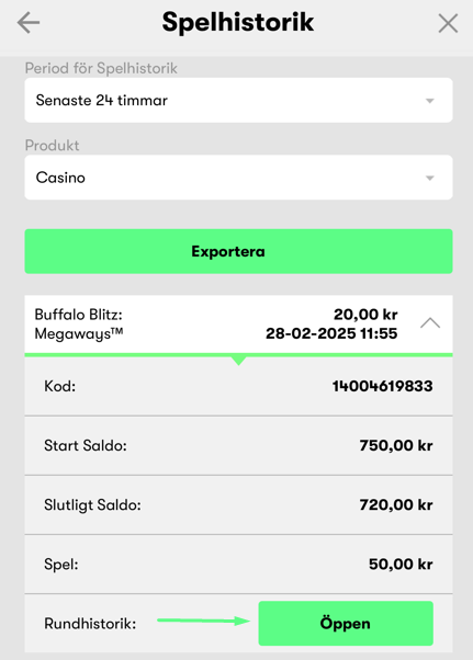 - Klicka på "Öppna" för att se din start- och slutbalans samt rundhistorik